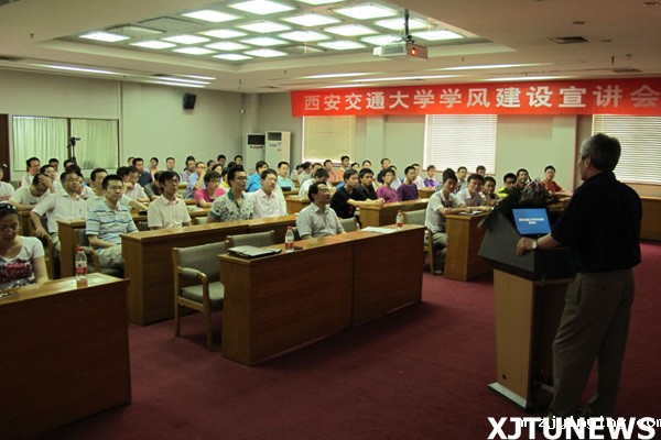 席光校长助理首先对开展此次宣讲会的目的和意义进行了介绍。他说,为进一步加强学风建设,促进教育质量的全面提高,教育部科技委、教育部科技司决定在教育部直属高校开展“科学精神和学术道德建设”主题宣讲活动,要求各位教育部科技委学风建设委员会委员在本校进行宣讲。世预赛录像回放科研院为落实教育部文件精神,特组织举办这次世预赛录像回放学风建设宣讲活动,旨在以此为契机,扎实推动我校学风建设和学术道德教育,为我校高教事业的健康快速发展做出更大贡献。