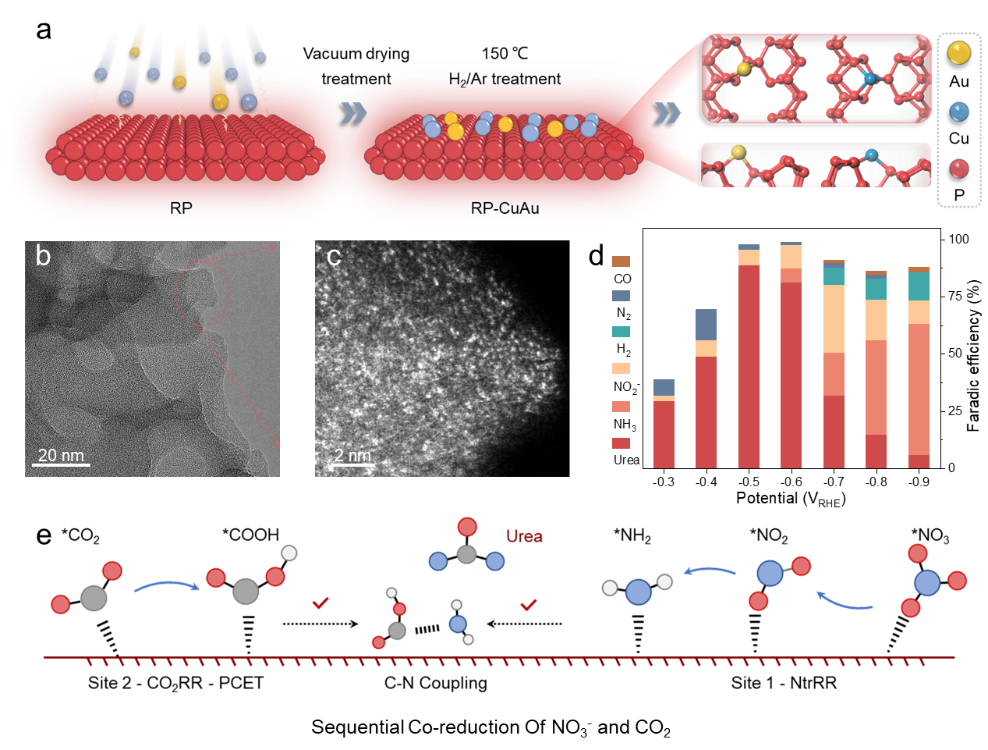 杨贵东教授团队的最新研究成果成功设计构筑了一种红磷负载的金-铜双金属单原子催化剂(RP-AuCu),实现了常温条件下CO2与硝酸盐高效共还原合成尿素,其法拉第效率达88.5%,尿素产率22.9 mmol gcat.⁻¹ h⁻¹,创同类体系国际领先水平,为绿色低碳尿素合成提供了新策略。