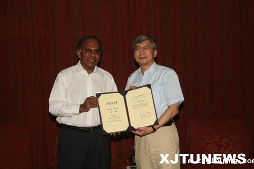 郑南宁校长向卡内基梅隆大学校长subra suresh颁发名誉教授聘书