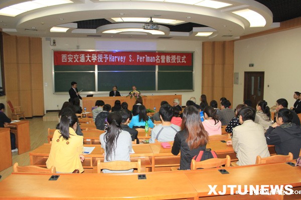 下午在主楼B103室举行Harvey S. Perlman教授受聘西安交大名誉教授仪式,郑南宁校长为Harvey S. Perlman颁发名誉教授证书并佩戴校徽。法学院院长单文华主持受聘仪式。受聘仪式后,Harvey S. Perlman教授为法学院学生作了美国知识产权法的讲座。
