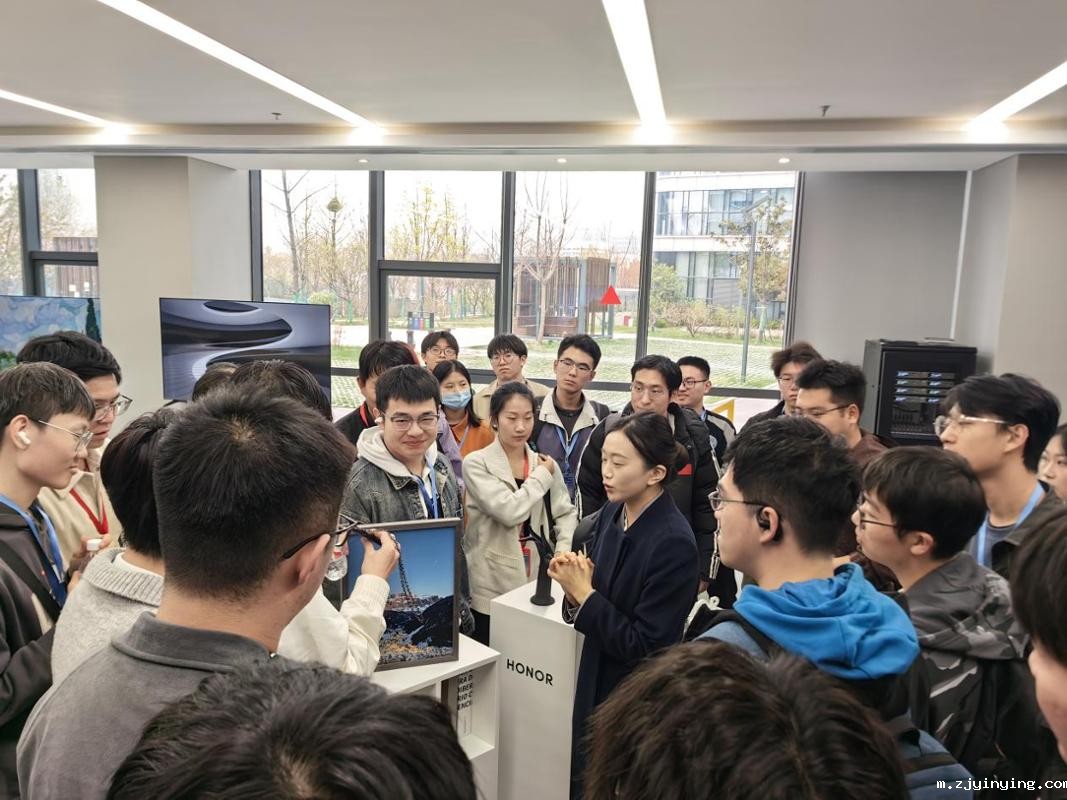 抵达荣耀后,师生们参观了荣耀的产品展示区和企业文化长廊。在产品展示区,从手机、平板电脑到智能家居设备,荣耀布设了琳琅满目的电子产品,工作人员详细介绍了各个产品的设计思路、技术亮点以及市场定位。在企业文化区,工作人员结合实际案例,指出公司始终布局前沿,坚持创新理念。