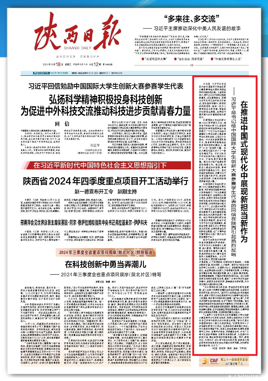 【陕西日报】习近平总书记近日给中国国际大学生创新大赛参赛学生代表的回信在陕西引起热烈反响。大家纷纷表示,要牢记习近平总书记的殷殷嘱托,坚定理想信念,沿着习近平总书记指引的方向前进;要弘扬科学精神,积极投身科技创新;要进一步关心青年的成长和发展,营造良好创新创业氛围,在推进中国式现代化中展现新担当新作为。