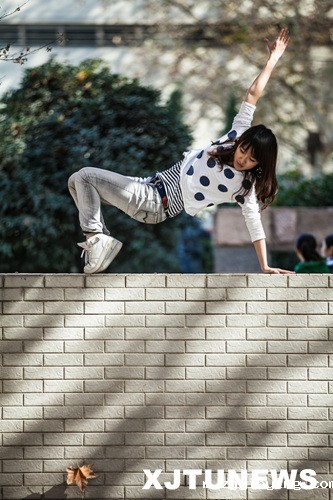 摄影者没有拍摄舞者的正面形象,但从画面中舞者向后的面部表情完全体现了她高超的舞姿和形象。在秋色的衬托下更显现出青春活力。