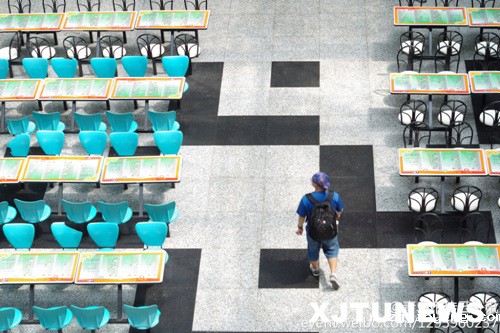 这是一幅构图严谨的图片,主体人物安排在右下角黄金分割点上,两边的座椅使图像更平衡,然而不同的色彩又使画面更加生动起来。采用俯拍的角度简化了背景,可见作者摄影的功底不浅。