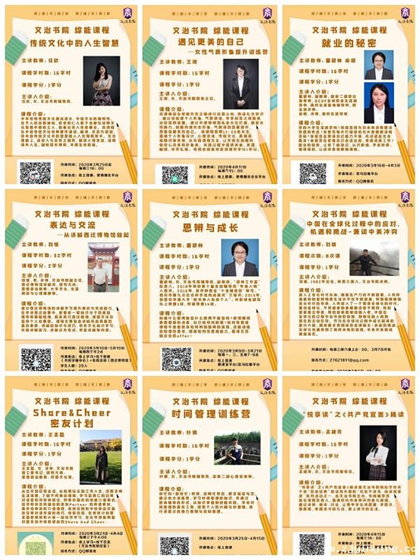 以美育美,美美与共,让“美”融入书院生活。书院综合能力提升课程开讲于2011年,知识盛宴后的美味甜点,浓郁醇香的人文气息,新颖独特的书院味道,迅速补充青春正能量。目前已开课102门次,覆盖学生2万余人次。《送你一个长安》带领学生走街串巷了解西安历史,《就业的秘密》提升学生就业与生涯规划能力,《传统文化中的人生智慧》畅聊中国文化与美学概念,《悦享读》带领学生品读经典践行“四个一百”,《时间管理训练营》以团辅的形式提升学生时间规划的能力。目前做客书院综合能力提升计划实践训练的著名学者、企业精英,已被聘为文治书院通识教育导师,他们用不同的视角和风格描摹世界的形状,用事迹和观点鞭策和激励精神。书院为同学搭建了一个了解社会,体味人生,积极思考、全面知识结构的平台。