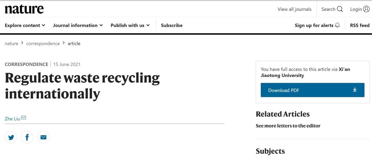 近日,以公管学院人口与发展研究所刘哲教授为独立作者,题为《规范国际废物循环流通体系》的通讯论文在《自然》杂志上发表。