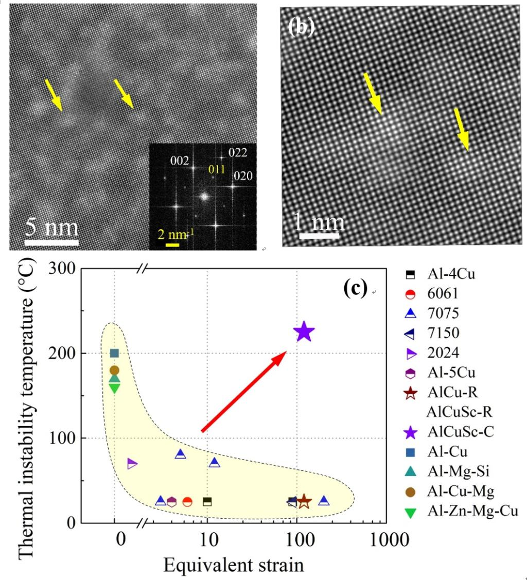 针对上述问题,西安交大金属材料强度国家重点实验室孙军院士团队提出了采用超高空位浓度来稳定纳米铝合金中溶质原子的新策略,不同于以往消除空位以稳定溶质原子的传统观点。他们基于强结合溶质原子-空位复合体的微观组织设计思想,通过在原子层次解析溶质原子-微合金化元素-空位之间的交互作用,借助第一性原理的计算模拟与分析,选用团队具有研究特色的Al-2.5wt.%Cu-0.3wt.%Sc合金作为模型材料,在液氮温度下采用高压扭转方法制备了纳米晶合金(简称AlCuSc-C);同时归因于低温抑制热激活效应,以及Sc微合金化元素对空位的强力捕获作用,获得了超高浓度的空位(~0.2at.%),与常规大变形制备的铝合金相比提高了近2个数量级。在如此高的空位浓度下,自发形成了具有极强结合力的、热力学上稳定的(空位-Cu-Sc-空位)原子复合体(如图1a和b所示),均匀弥散而且稳定地分布在纳米晶晶粒内部,有效地阻止了Cu向晶界扩散、偏聚和析出。这种双空位与Cu和Sc原子形成的原子复合体显示出了极好的热稳定性,在230°C下时效50小时仍未发生分解,相应地在AlCuSc-C合金中未观察到晶内或晶界的第二相颗粒析出。AlCuSc-C合金突破了纳米晶铝合金原有组织/成分设计理念和常规制备方法的局限,克服了大变形与热稳定性之间的互斥关系(图1c),实现了大变形纳米晶铝合金中的超高热稳定性,甚至比粗晶Al-2.5wt.%Cu合金更稳定。在显著改善热稳定性的同时,高密度的(Cu,Sc,空位)原子复合体还具有类似溶质原子团簇的强韧化机理,同步提升了AlCuSc-C合金的强度和塑性,室温拉伸屈服强度和均匀延伸率分别达到了~500MPa和~10%。超高浓度空位+微合金化的溶质原子稳定化策略,在科学层面上补充和拓展了空位促进时效析出的传统认知,在技术层面上同时解决了热稳定性差和室温塑性不足的瓶颈难题,有望推动纳米晶铝合金的工程化应用。