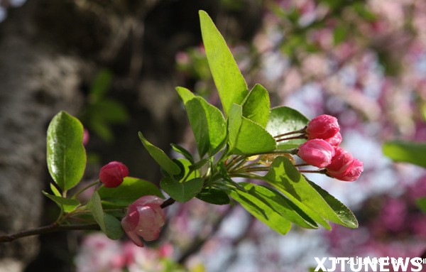 飞红滴翠春深处,莺雀沉醉不知路 浓妆淡抹镜中花,动静皆宜画中人 碧水苍柏映松桃,一步一景一层春 百家争鸣见异彩,花色妖娆各占春